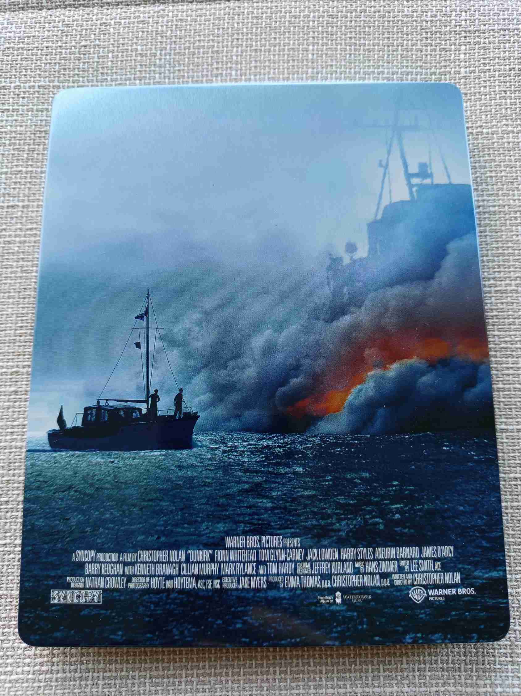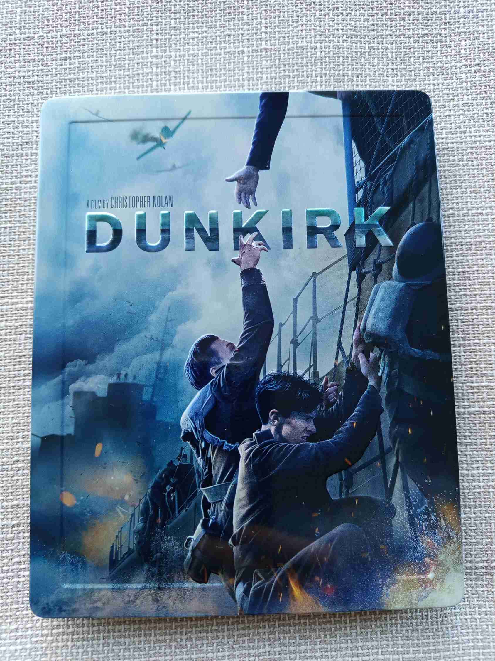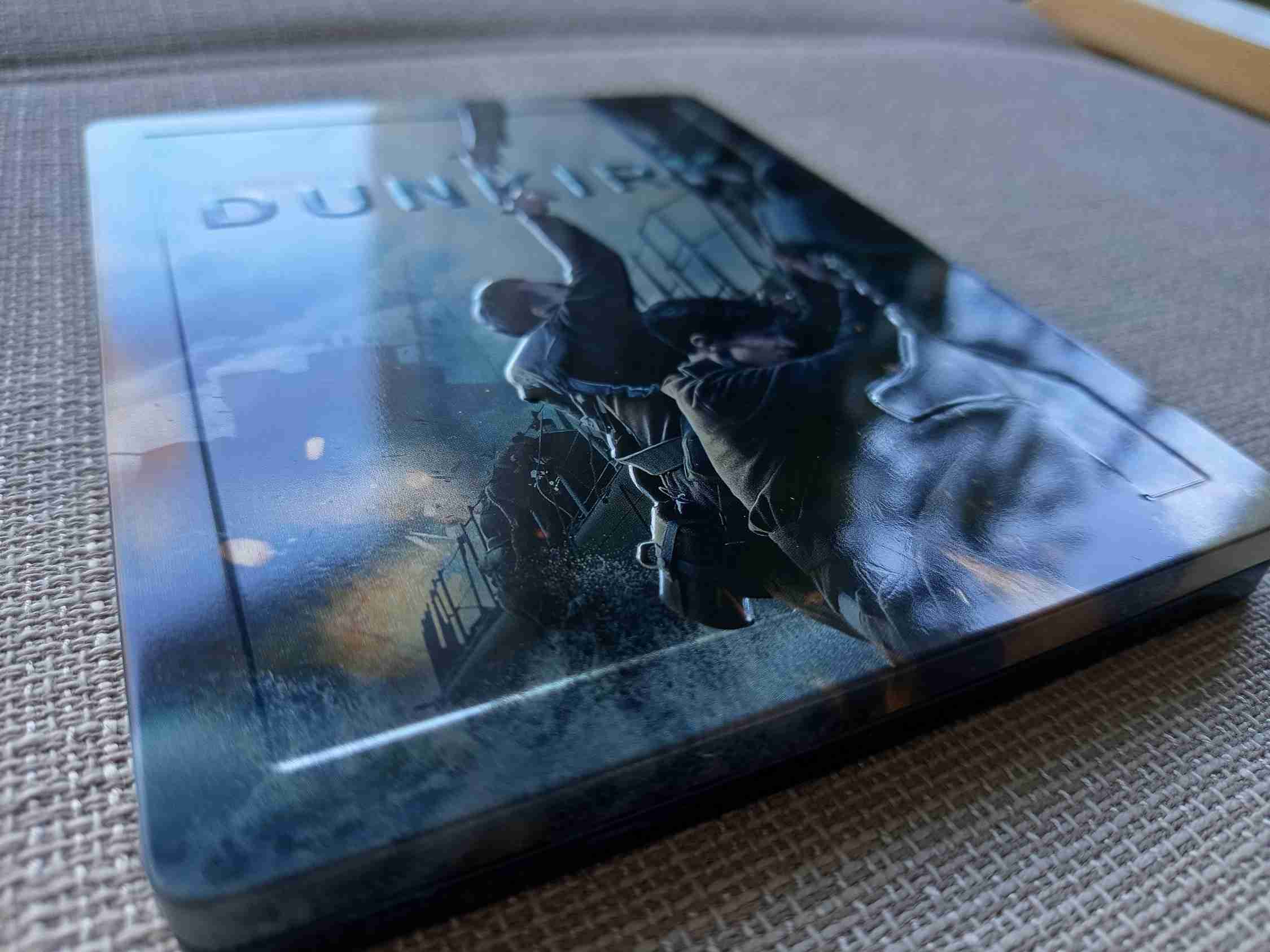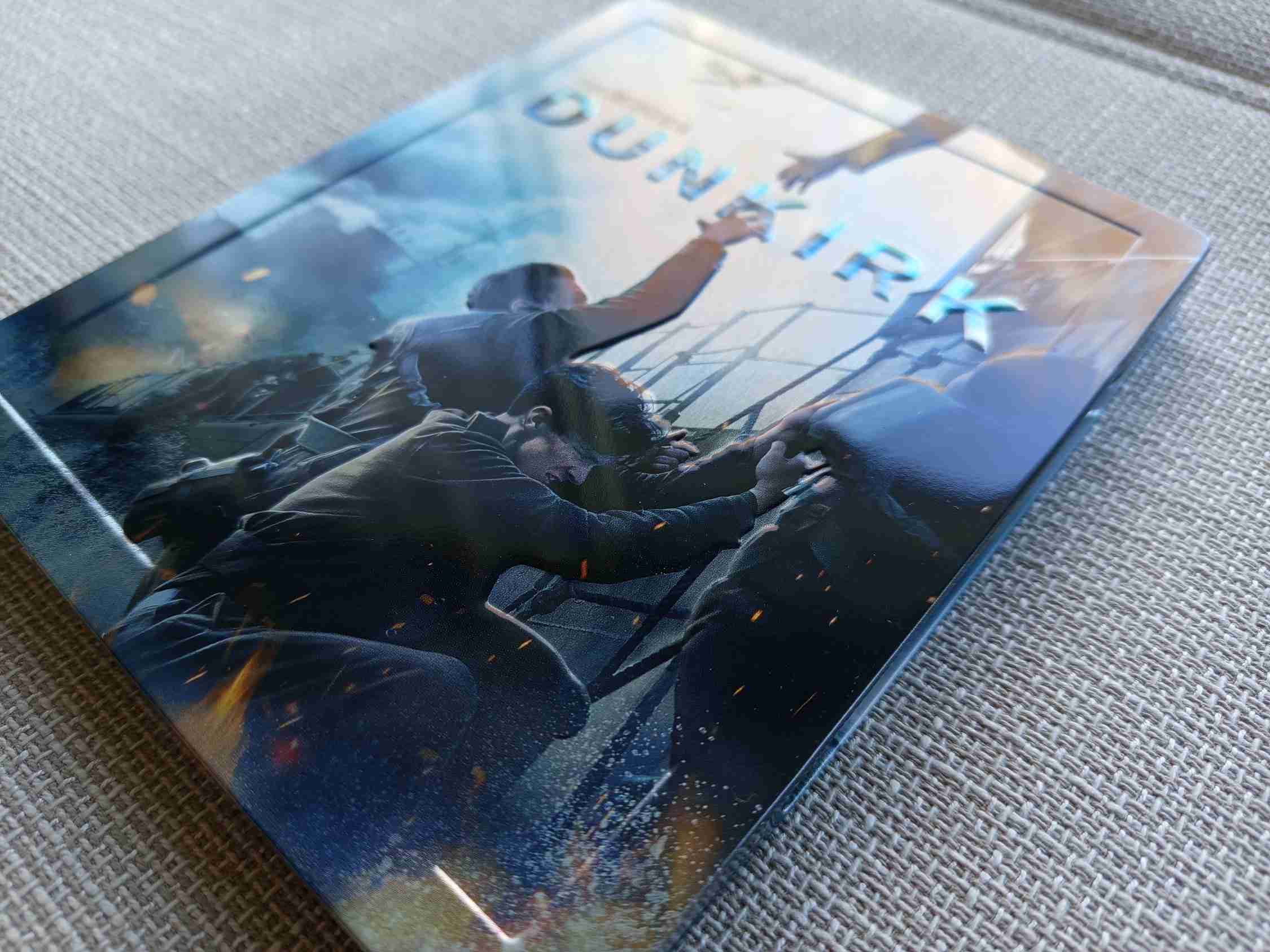 Réception du steelbook 4k blufans de Dunkerque, dans son édition SL. Il faut reconnaître à blufans un savoir-faire certain en matière d’embossage, ce n’est pas ce dernier steelbook qui nous démentira. Le verso est vraiment bluffant (si j’ose dire), l’embossage titre + persos fonctionne très bien sur ce visuel que je trouve particulièrement évocateur au regard du film. Il y a de beaux reflets métalliques dans le vernis, de qualité, mais à mon avis un poil inférieur à ce que peut nous proposer Manta sur ses dernières productions. Le lenti est encore une fois très impressionnant. Recto :