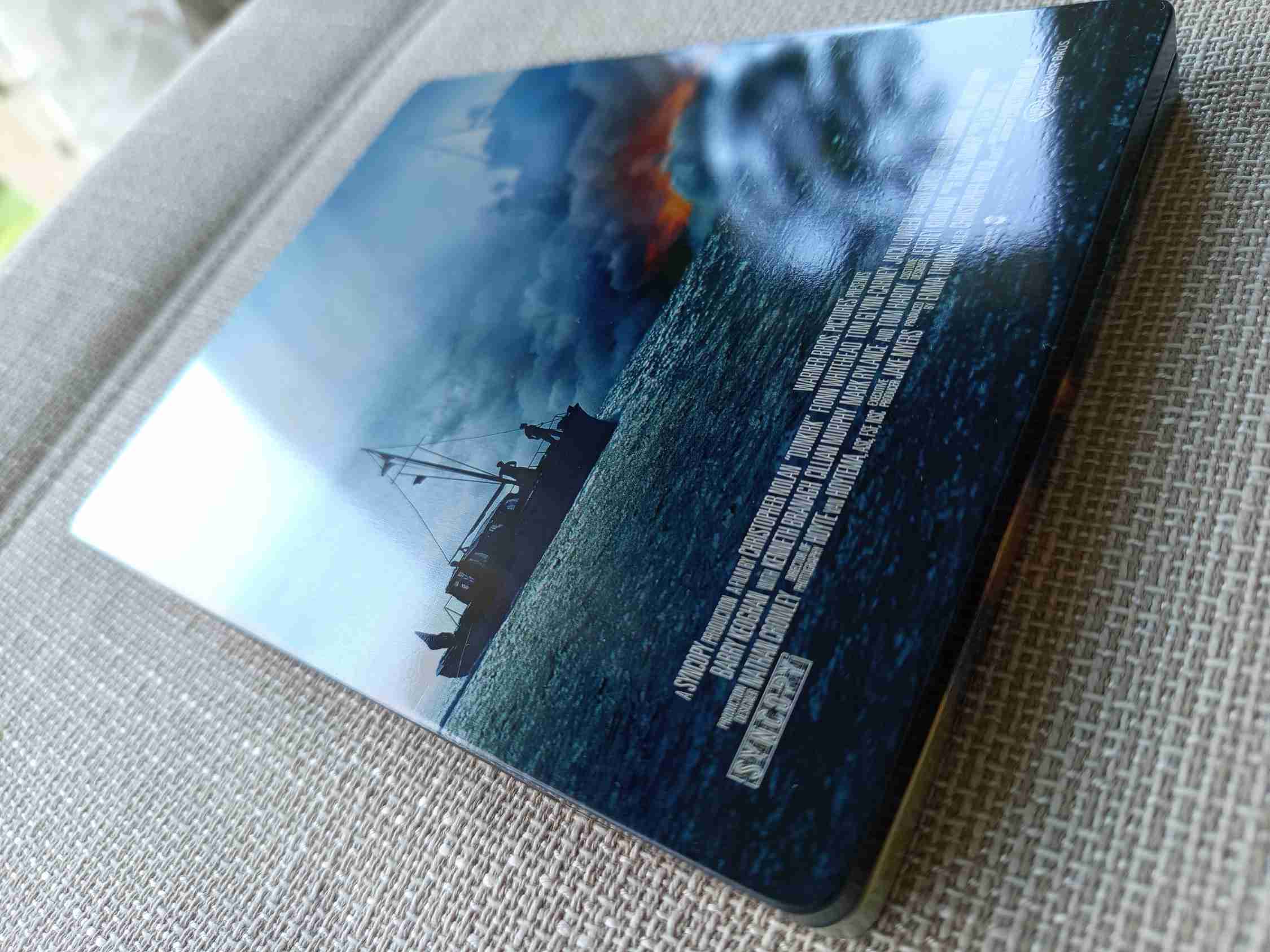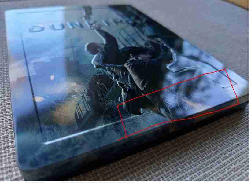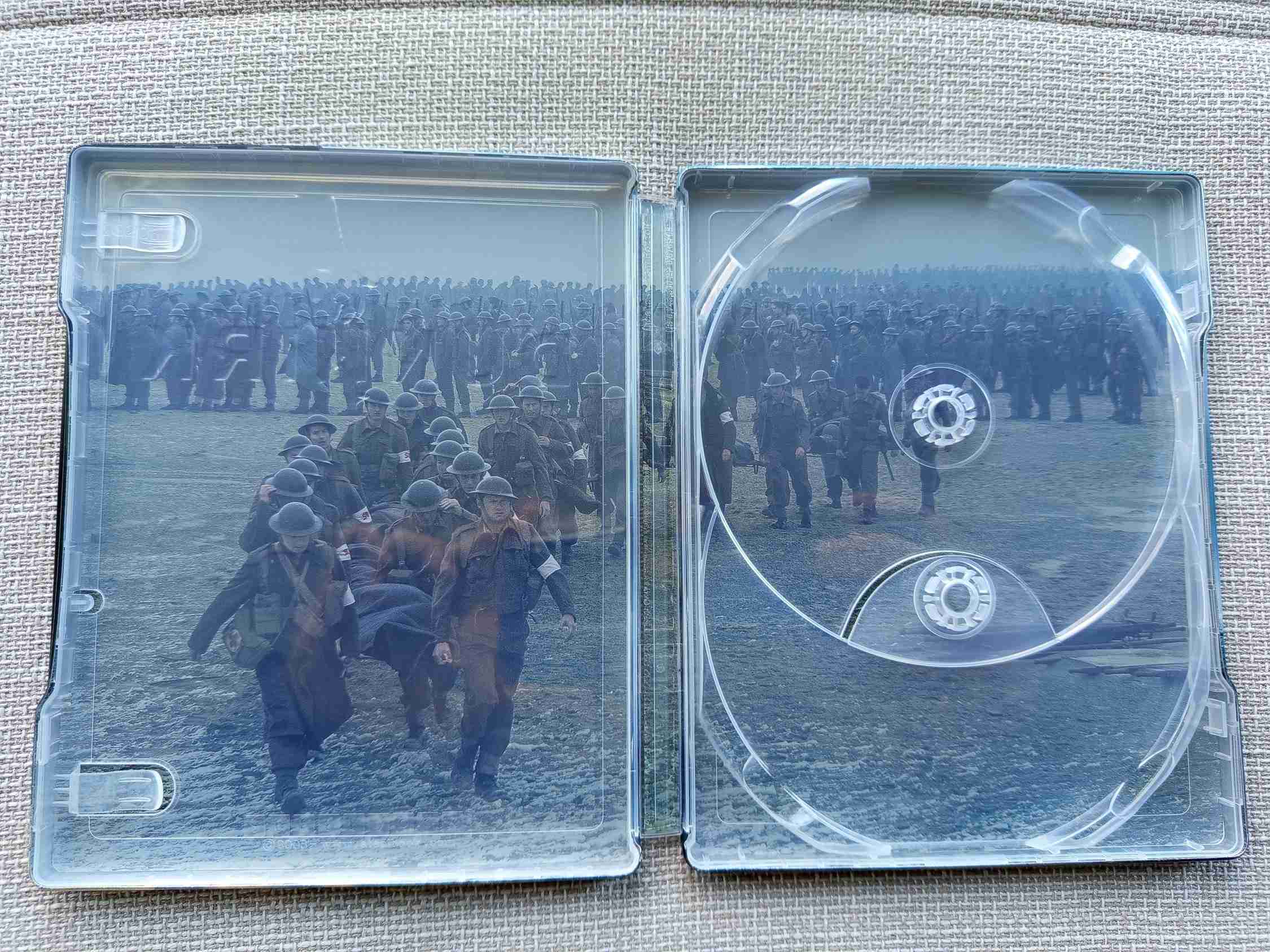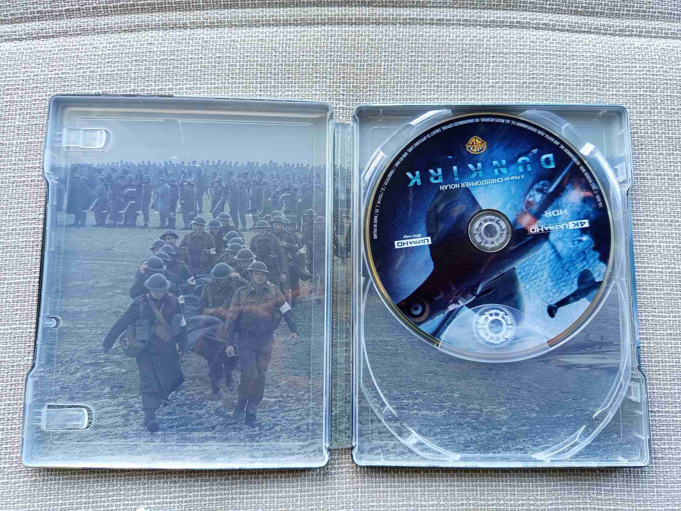 Réception du steelbook 4k blufans de Dunkerque, dans son édition SL. Il faut reconnaître à blufans un savoir-faire certain en matière d’embossage, ce n’est pas ce dernier steelbook qui nous démentira. Le verso est vraiment bluffant (si j’ose dire), l’embossage titre + persos fonctionne très bien sur ce visuel que je trouve particulièrement évocateur au regard du film. Il y a de beaux reflets métalliques dans le vernis, de qualité, mais à mon avis un poil inférieur à ce que peut nous proposer Manta sur ses dernières productions. Le lenti est encore une fois très impressionnant. Recto :