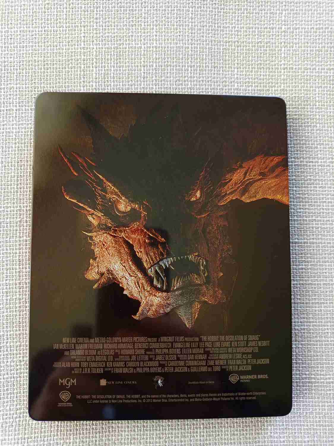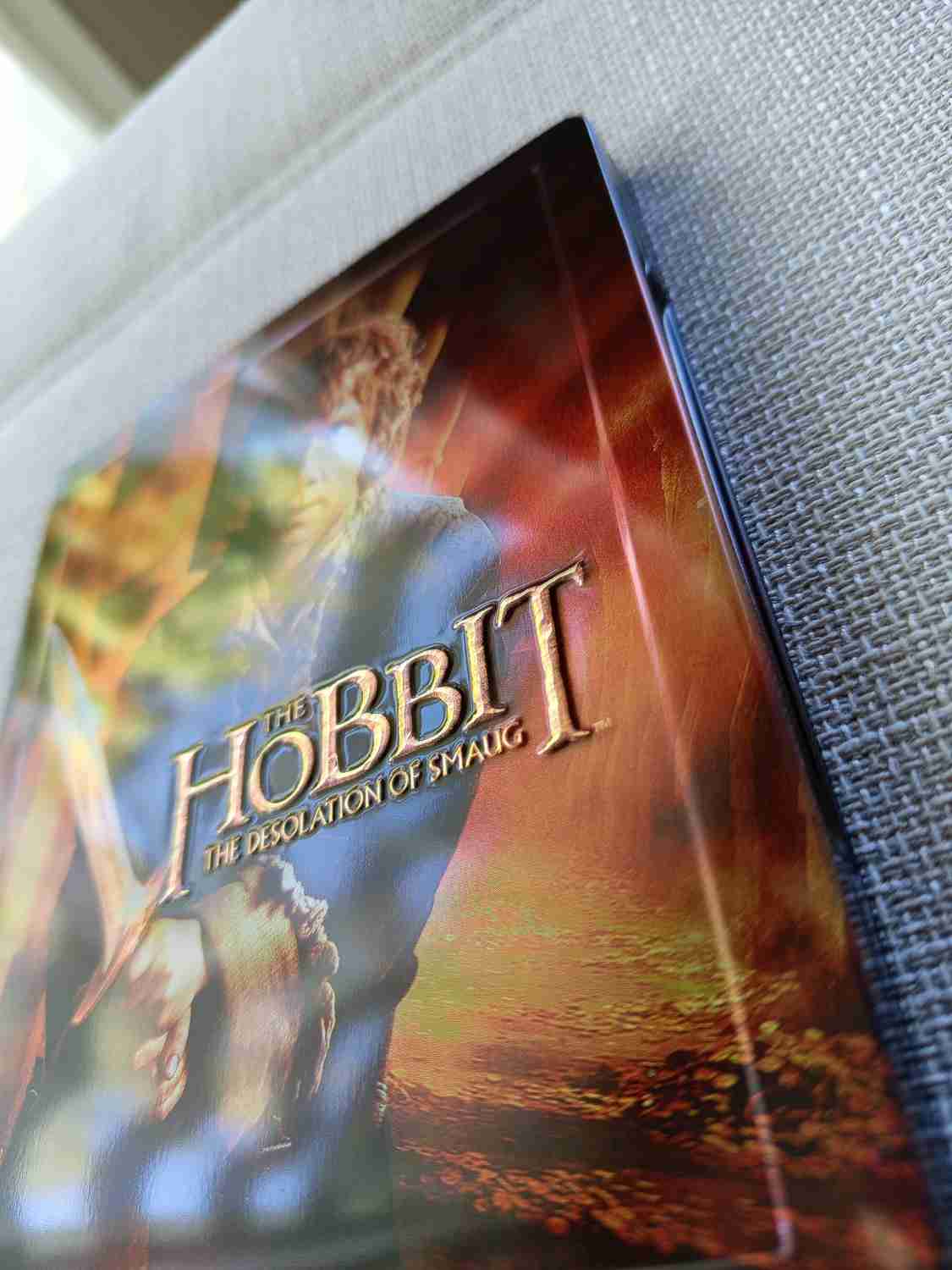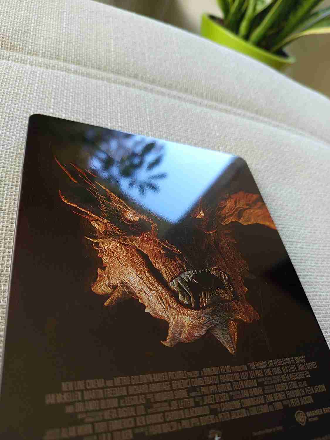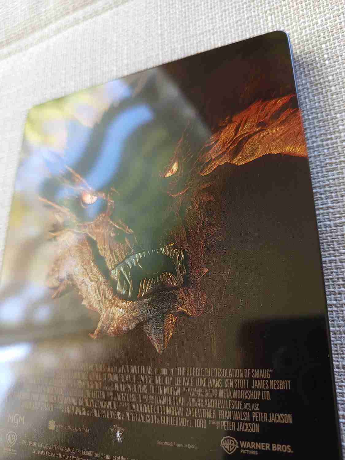 On continue avec The desolation of Smaug (2013). Même constat sur les finitions, avec des visuels que je trouve encore plus réussis. Il y a eu pas mal de retours sur le steelbook en lui-même, concernant une défaillance du contrôle qualité. Des acheteurs ont signalé des pocs et autres paint chips, pour ma part je m’en tire bien en ayant à déplorer seulement quelques micro rayures visibles sous forte lumière artificielle. Photos du recto :