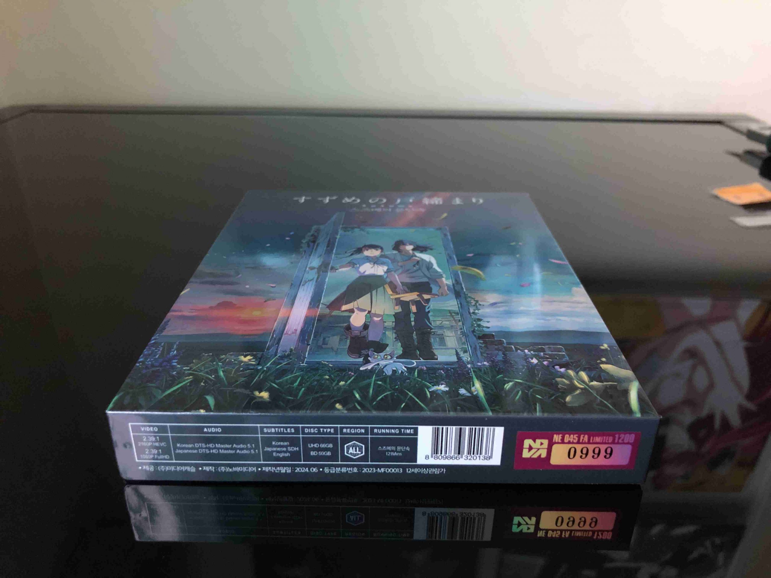 Novamedia – Suzume – 4K – WEA – FSA 999/1200 Je voulais aussi celui-ci depuis un certain temps, le FullSlipA de Suzume par Novamedia. Avec son magnifique FullSlip holographique, spot embossé sur les personnages, les feuilles, la porte, le mur et le titre. L’effet holographique est tout simplement magnifique, tout comme les couleurs. Le Steelbook est très beau, avec un magnifique vernis et une haute résolution ! Il est bourré d’highlight sur les traits de l’eau, les murs, les fils, les nuages ! Le recto est parfait, et le verso est tout simplement magnifique ! C’est juste dommage que le… Read more »