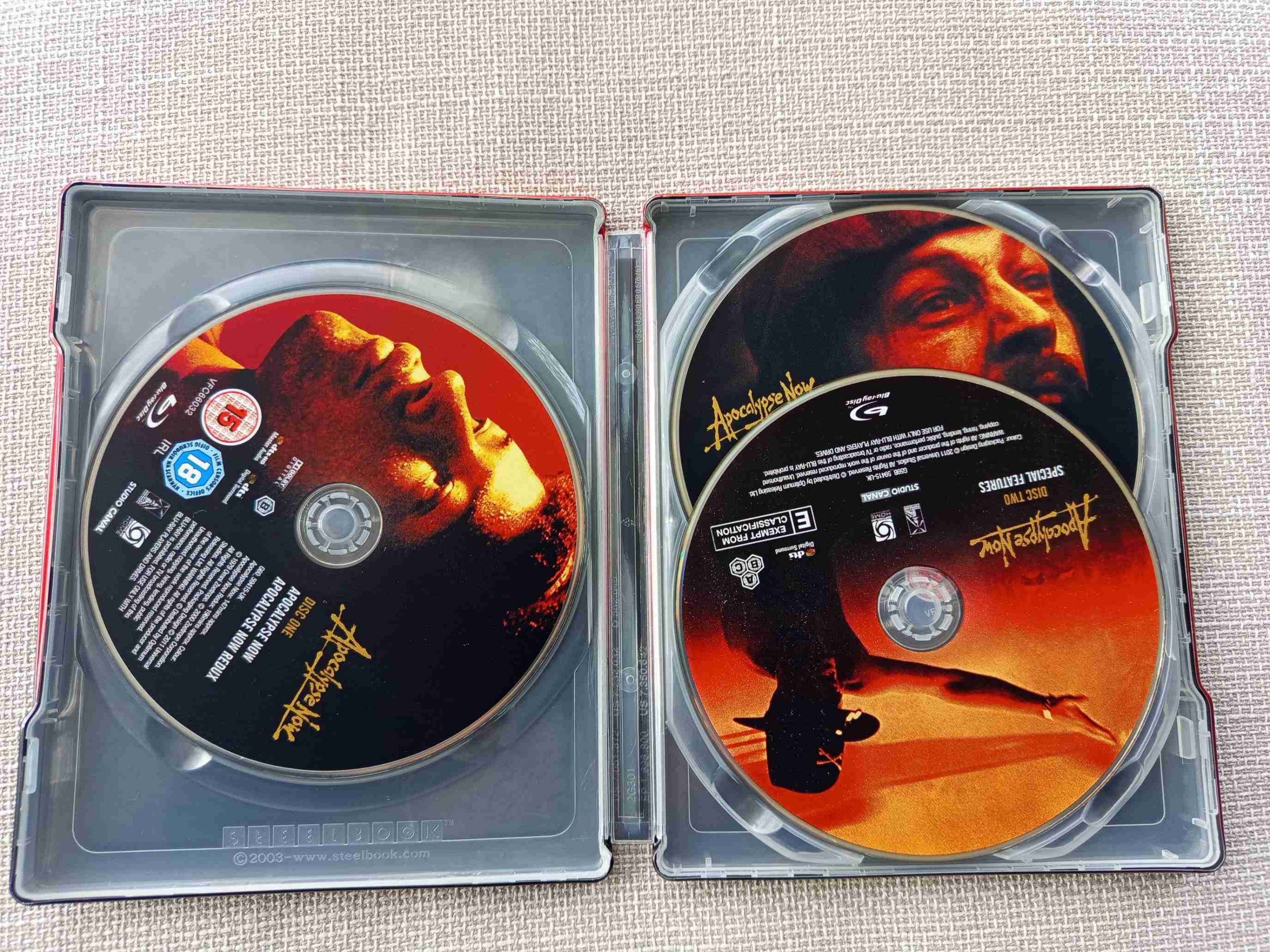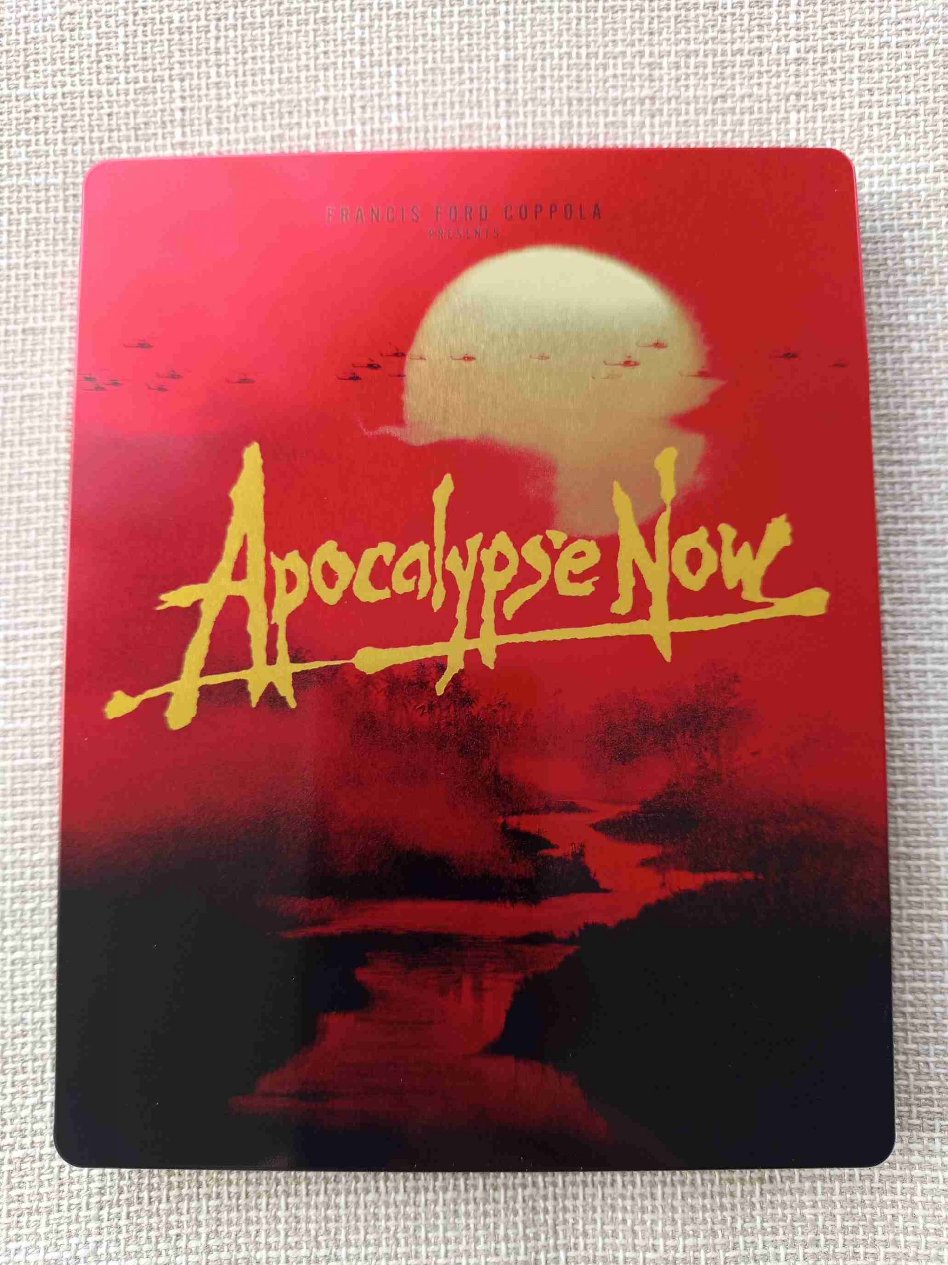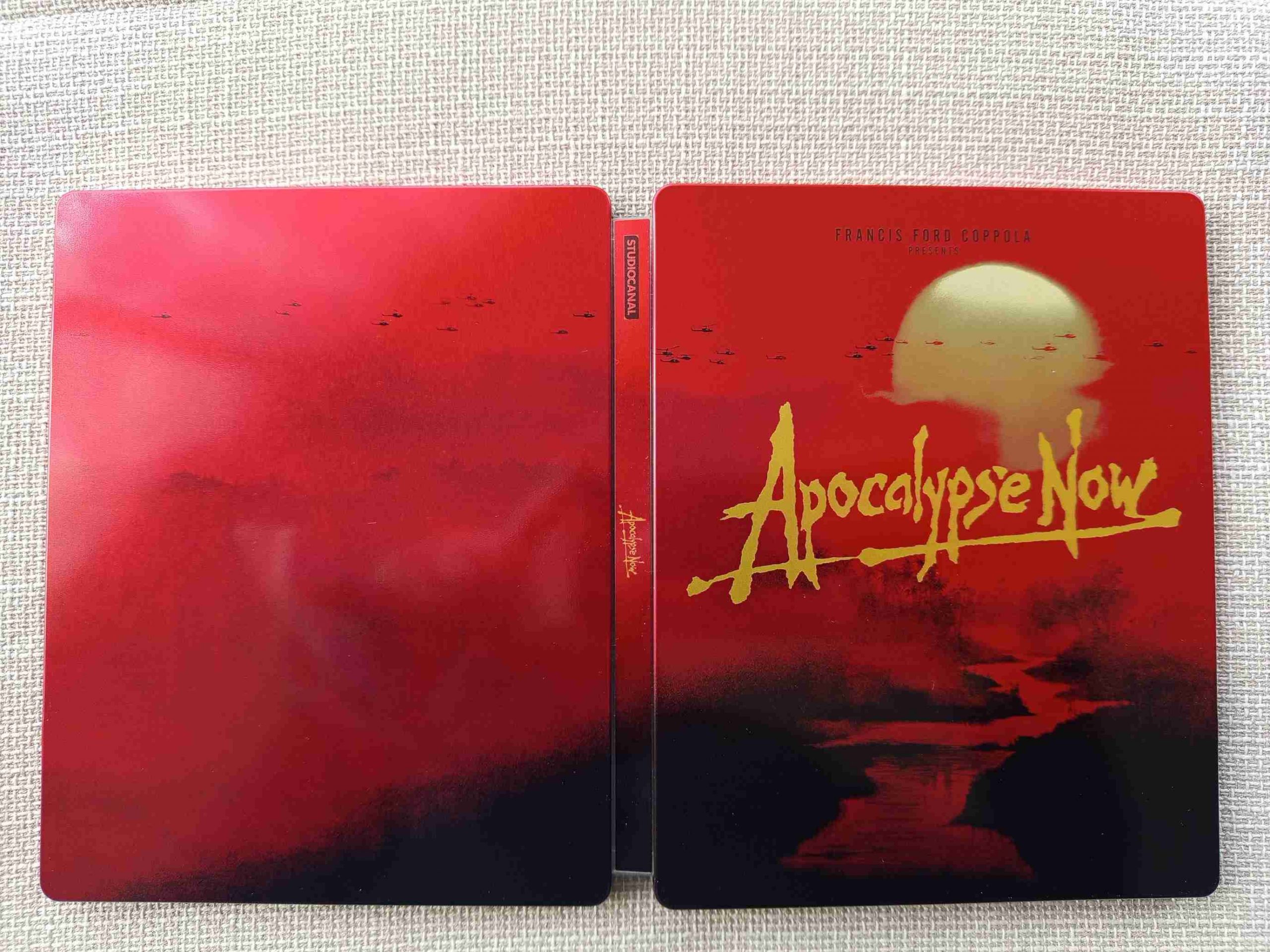 Réception du steelbook d’Apocalypse now (StudioCanal éditeur, édition de 2015). Il existe pléthore de steels pour ce film, j’en ai eu un certain nombre et je me suis débarrassé de l’ensemble pour me concentrer sur celui-ci, que je trouve le plus « évocateur ». On peut presque sentir l’odeur du napalm au petit matin… Les visuels sont parfaits pour moi, il y a une belle continuité, le vernis rutile comme il faut. Bref, c’est le plus beau ! D’accord ou pas ?