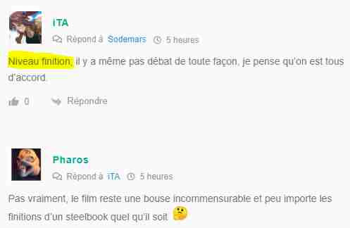 Certes mais sa réponse est inutile dans ce débat On parlait uniquement du Steelbook, et JE parlais uniquement du Steelbook, donc tu m’excuseras de pas capter sa réponse Et encore une fois, c’est pas car vous n’aimez pas le film, que certains ne l’aiment pas, donc ce n’est pas car vous ne voulez pas l’achetez, qu’importe la qualité, que tout le monde est dans votre cas et qu’on a pas le droit de parler de la qualté du Steelbook. Dans ce cas-là sa réponse est totalement hors sujet, et de deux déplacé si tu veux mon avis Vu que vous… Read more »