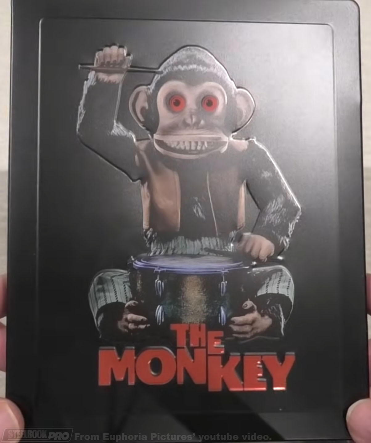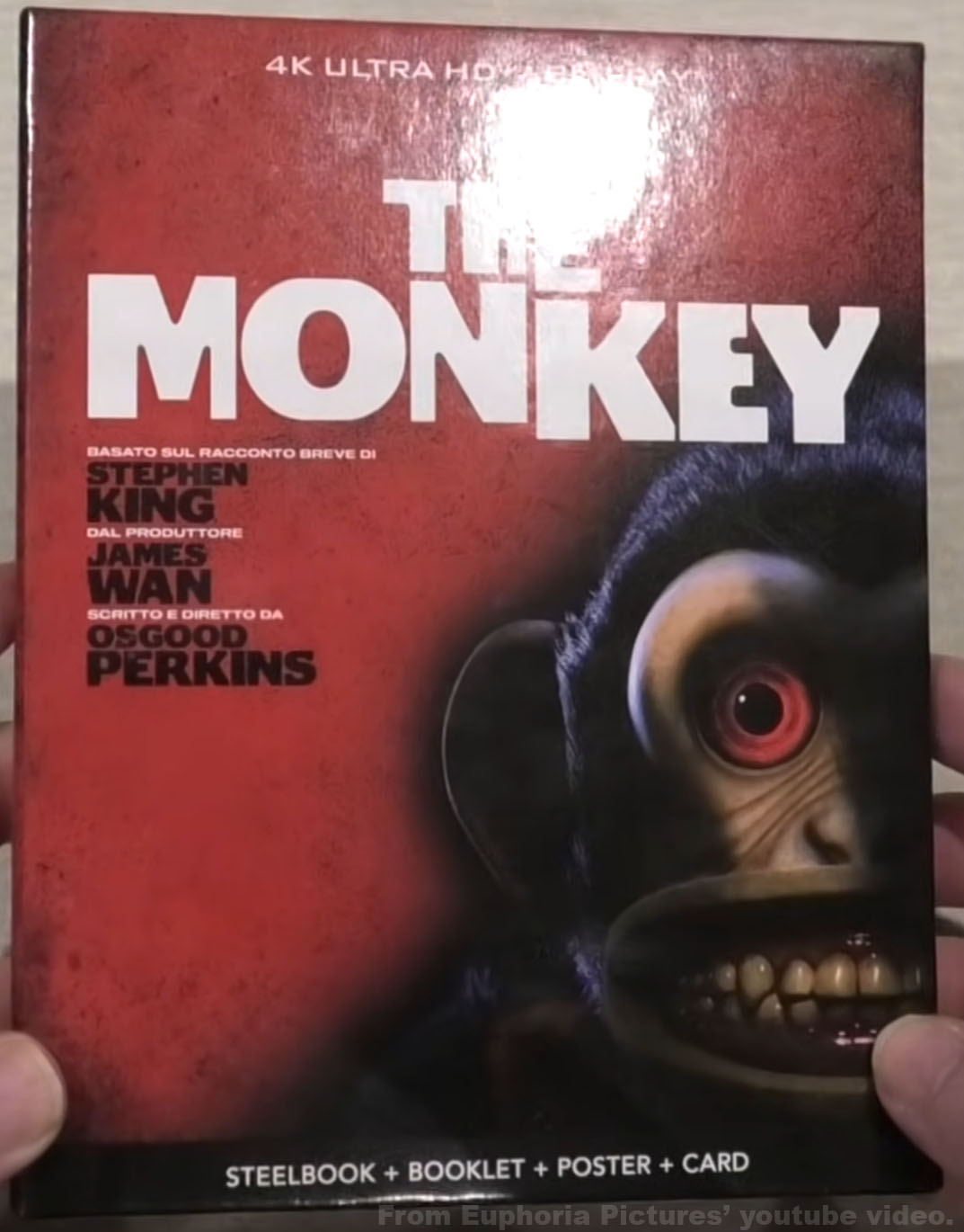 — MAJ le 22 janvier 2026 — Voici un aperçu du steelbook 4K DE de « The Monkey« , il bénéficie d’un bel embossage du singe et du titre ainsi que d’une petit spot-gloss sur les yeux et sur l’image du verso. Ce même steelbook est sorti dans une édition collector en Italie (encore dispo) pour moins cher. Pas de VF.