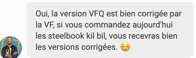 Avez-vous remarqué? Les Kill Bill sont revenus en commande sur AMZ et Cultura, en plus de la Fnac (où ils n’ont jamais été retirés d’ailleurs)… Je ne comprends pas trop là à quoi tout le monde joue, c’est defectueux finalement ou pas? Ils retournent à StudioCanal ou pas? C’est pour laisser une chance à certains exemplaires de trouver leur public au lieu qu’ils partent au recyclage? J’espère en tout cas que cela ne va pas retarder encore plus les vrais exemplaires avec la vraie VFF que l’on attendait.