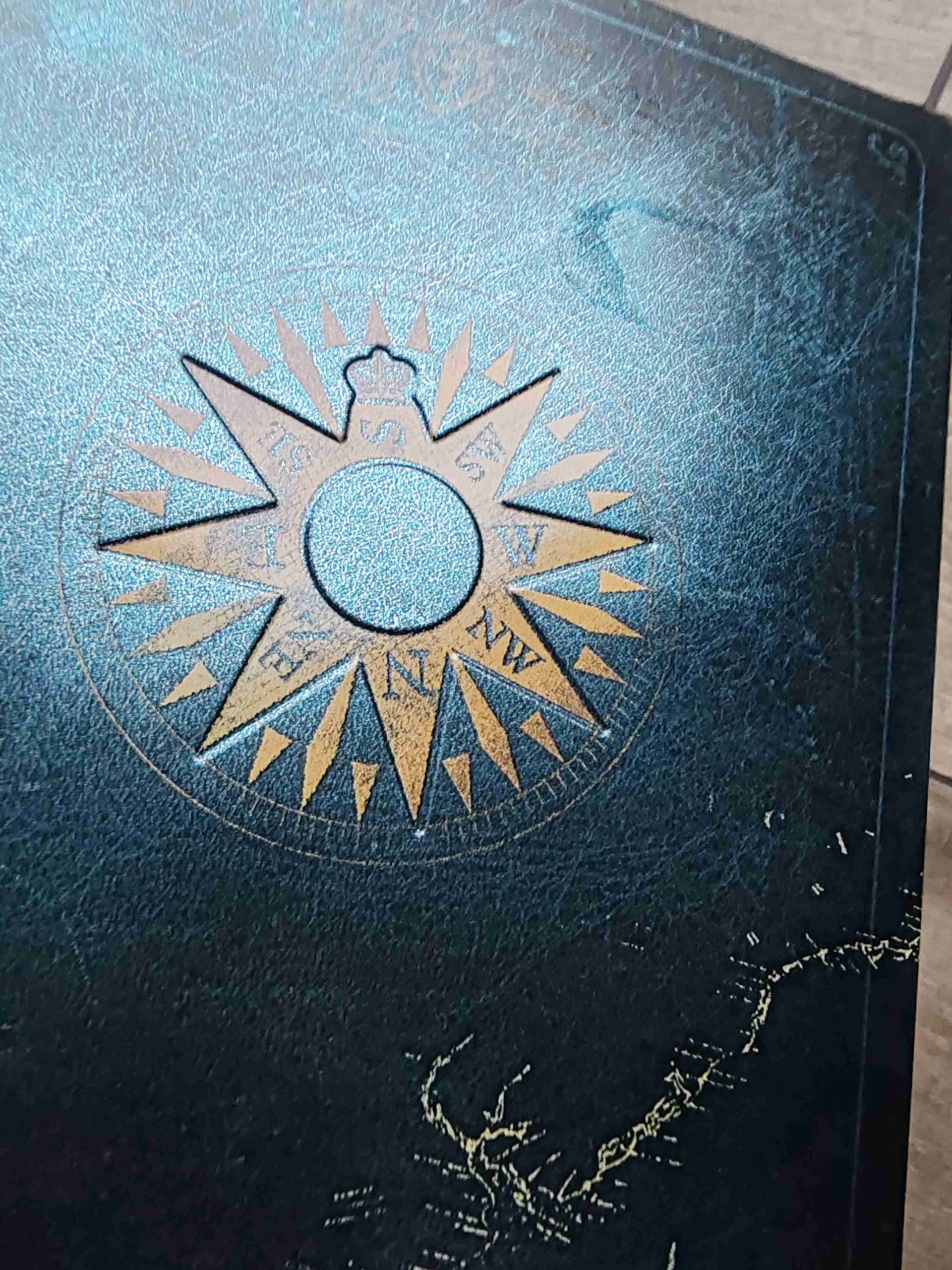 Débossage du badge du titre (ça fait pauvre), et de la boussole au verso. Pas de quoi casser des briques.