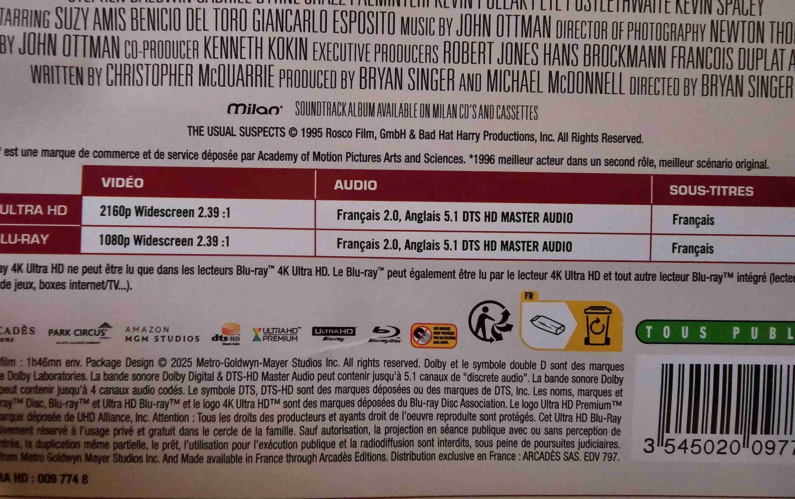 — 17 septembre 2025 — Le film « Usual Suspects » arrive en steelbook 4K en France. Le visuel du recto a été dévoilé.