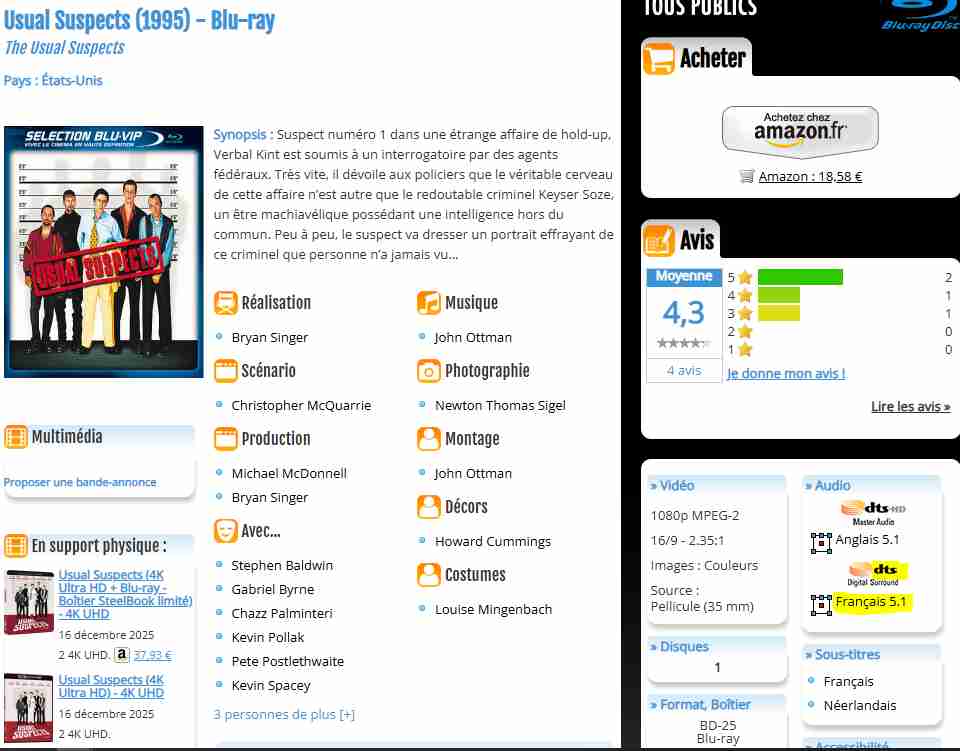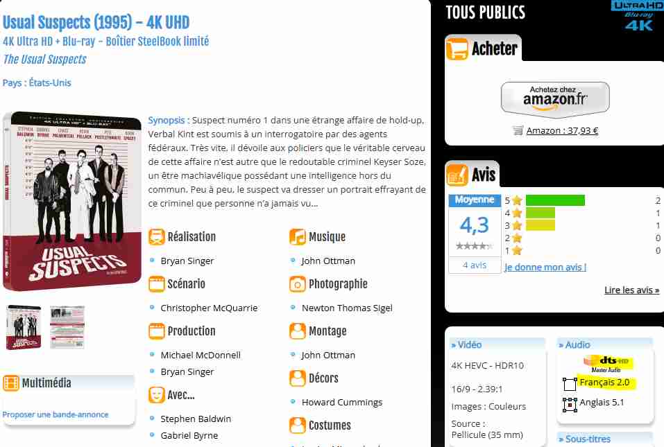 Rha ouais, en plus c’est mentionné et tout… Abusé… Tain c’est zarbi, sur bluray . com, ils mentionnent très clairement DTS-HD MA 5.1 :O Alors que sur le BluRay c’était une DTS, du moins sur le Digibook qui est sortie en 2013… C’était cependant bien une DD 2.0 sur le BluRay qui est sortie en 2010. D’après bluray . com… Erreur de bluray . com?? hum… En tout cas sur les trackers, 4K disponible avec EAC3 5.1 768Kbps, mais également la DTS 5.1 768Kbps, et pas du tout de 2.0, prit sur le BR s’il te plaît… Donc le BR… Read more »