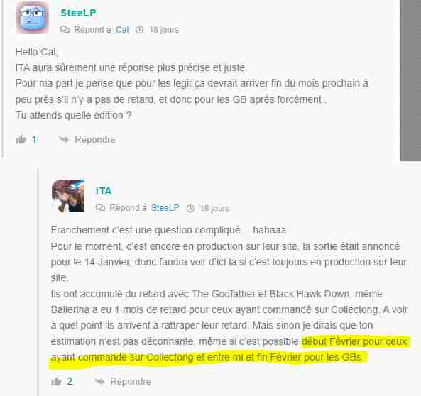 Franchement c’est une question compliqué… hahaaa Pour le moment, c’est encore en production sur leur site, la sortie était annoncé pour le 14 Janvier, donc faudra voir d’ici là si c’est toujours en production sur leur site. Ils ont accumulé du retard avec The Godfather et Black Hawk Down, même Ballerina a eu 1 mois de retard pour ceux ayant commandé sur Collectong. A voir à quel point ils arrivent à rattraper leur retard. Mais sinon je dirais que ton estimation n’est pas déconnante, même si c’est possible début Février pour ceux ayant commandé sur Collectong et entre mi et… Read more »