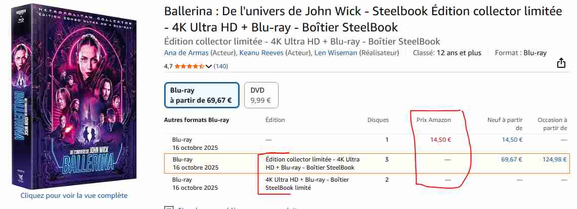 Ensuite des fois c’est le contraire, par exemple le Collector de Ballerina a été sold out très rapidement après la sortie sur Amazon, j’serais pas étonné qu’ils n’aient pas réussi à honorer toutes les précos LOL Et même le Steelbook seul tu le trouves plus sur Amazon, hormis en vente partenaire à 47€ LOL Plus chère que le Collector hahaaa Mais il est encore sur la Fnac… Pas étonnant car ils n’ont pas baissé les prix, ils sont 10€ plus chère que Amazon Mais au bout d’un moment il y en aura plus, alors que l’Amaray oui. Donc ouais un… Read more »