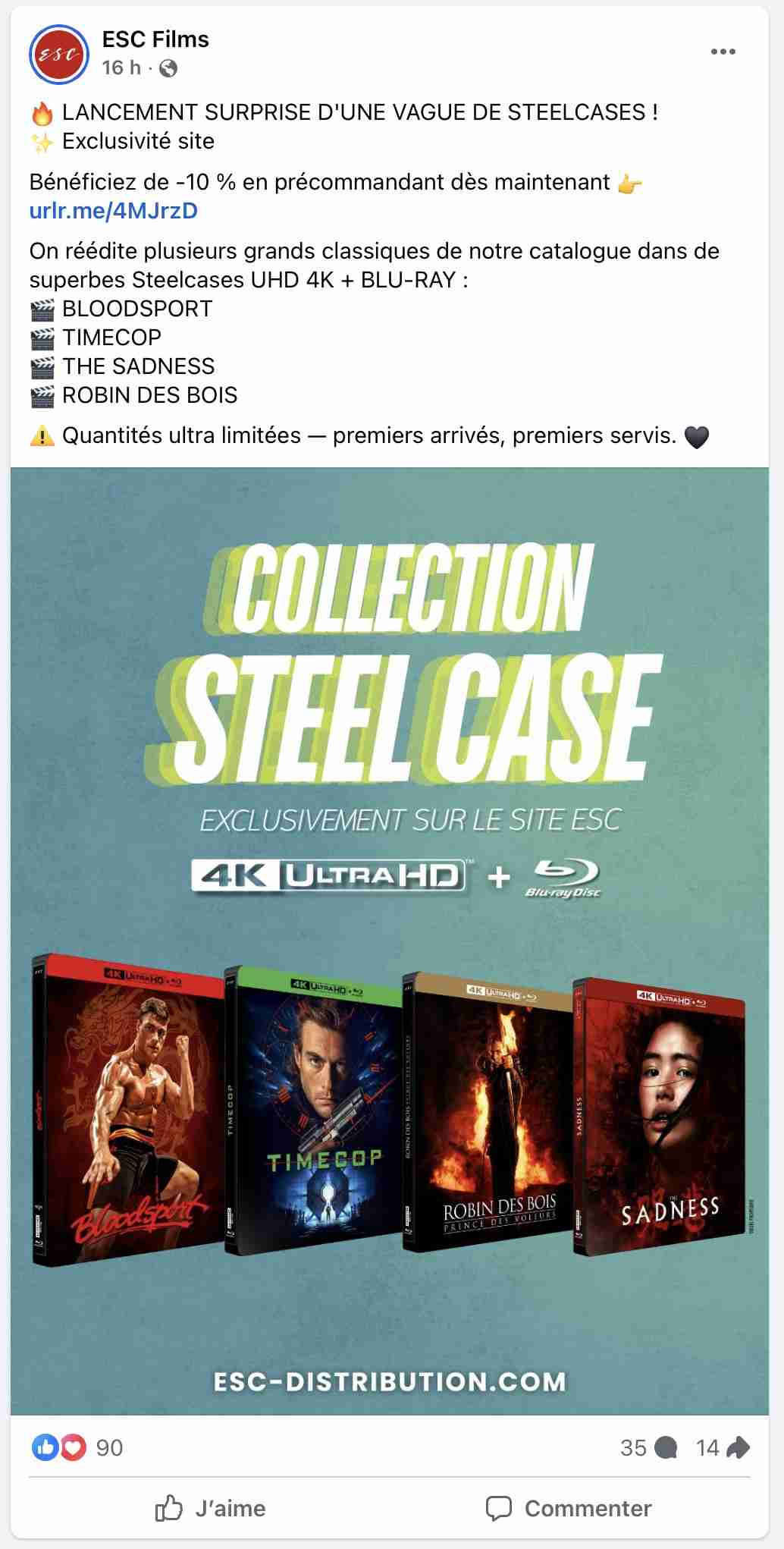 Evidemment, si ESC ne sort pas du JCVD ils n’ont rien à proposer. Quel gâchis d’avoir ENCORE Bloodsport qui a déjà 50 éditions au lieu de nous proposer des inédits en 4K.
