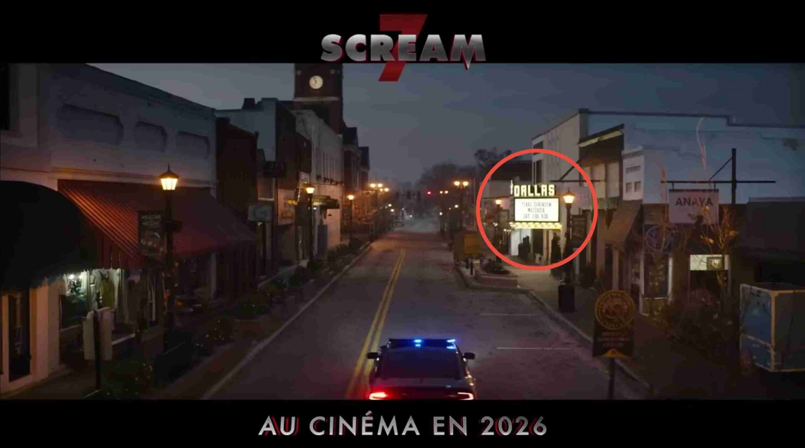 Dans le film, ce n’est pas « Stab » qui est à l’affiche du cinéma Dallas de la ville de Pine Grove mais « Texas Chainsaw Massacre ».