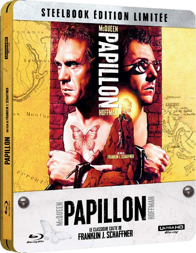 — 22 mars 2026 — Le film avec Steve McQueen et Dustin Hoffman « Papillon » (1973) aura droit à un steelcase 4K en France. Edition limitée à 200 exemplaires ! Il est donc probable que le steelbook soit exclusif à la boutique éditeur (lien plus bas).