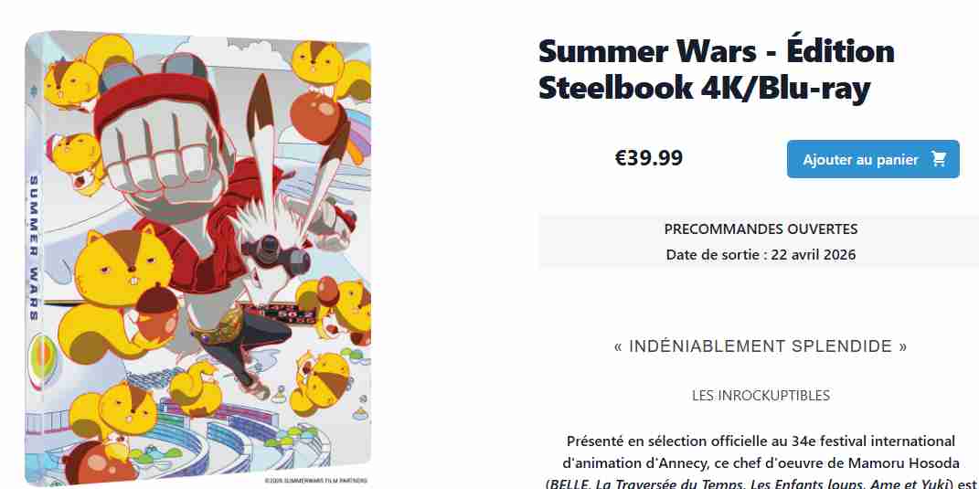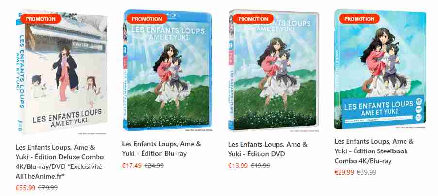 T’as les Enfants Loups aussi là, même prix que Summer Wars (bon fait pas trop attention aux promos car sur leur site ils sont en campagne Pâques jusqu’au 17 Avril sur les sorties hors Préco, d’ailleurs il y a des offres sympas) mais il y avait le Collector et le Steel avait que 2 disques comme Summer Wars, doit être pour ça je dirais…